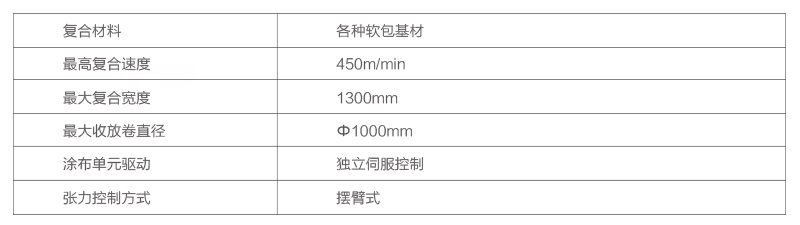 主要技術參數適印材料塑料薄膜、紙張等卷筒材料最高機械速度450m/min復合寬度850,1050,1250,1450,1650mm最大收、放卷直徑Ф1000mm.............